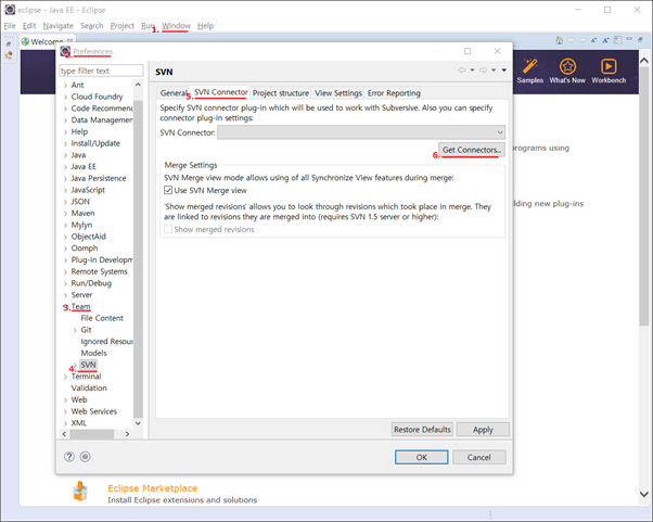 - Window -> Preferences -> Team -> SVN -> SVN Connector Kit가 보이면 설치 성공