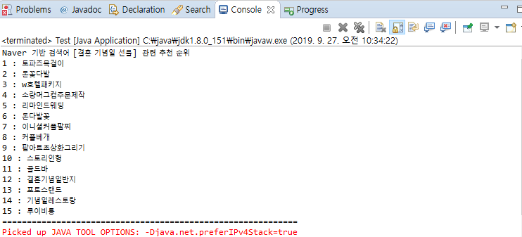 System.out.println("Naver 기반 검색어 [결혼 기념일 선물] 관련 추천 순위 ");
