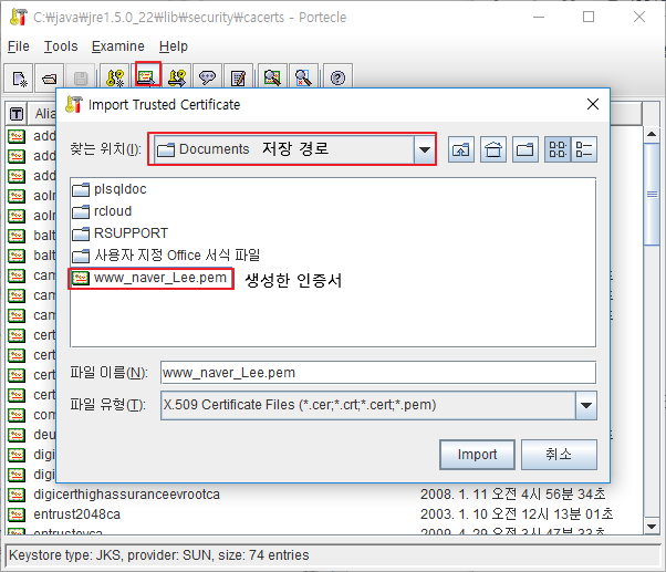 구동중인 자바 버전의 $JAVA_HOME/lib/security/cacerts 파일을 열어서 새로 생성된 인증서를 추가합니다.