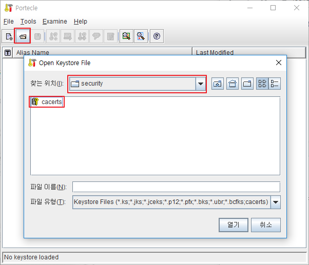 설치 완료 후 해당 폴더의 portecle.jar 파일을 실행