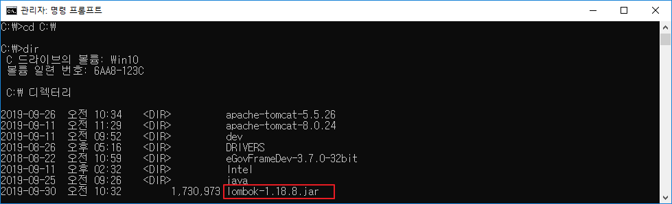 - cmd를 실행시켜서 lombok.jar이 설치된 경로로 이동