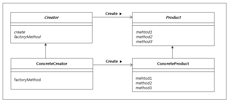 Product의 역할과 인스턴스의 생성 메소드를 가집니다.new연산자를 사용해 실제 인스턴스를 생성하는 대신에, 인스턴스 생성을 위한 메소드를 호출해서 구체적인 클래스 이름에 의한 속박에서 상위 클래스를 자유롭게 만듭니다.