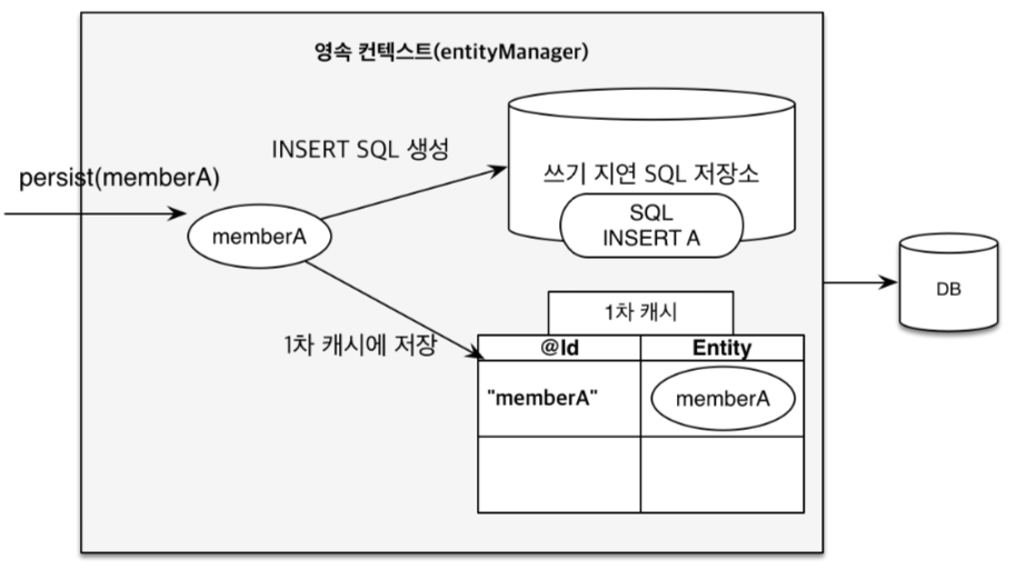 1번 1차캐시에서 설명한 내용처럼psersist()시점에 DB에 INSERT를 실행하는게 아닌 commit 시점에 추가/수정/삭제 쿼리를 발생 시킴, 이는 1차 캐쉬와 별도로 쓰기 지연 SQL 저장소라는 공간에서 SQL문을 관리하기 때문,