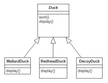 우선 Duck라는 부모 클래스와 하위 클래스로 MallardDuck, RedheadDuck가 존재한다고 가정합니다.