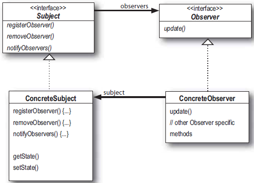 }Subject: '관찰되는 대상'을 관리하는 요소 인터페이스. Observer를 저장, 삭제, 알려주는 메소드를 선언합니다.Observer: '상태가 변화됨'을 관리하는 요소 인터페이스. 통보당했을 때 처리할 메소드를 선언합니다.DisplayElement인터페이스는 행동을 추상화하기 위한 인터페이스로 화면에 그려줄display()메소드를 선언합니다.