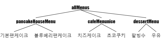전체 트리의 맨 위구조를 가질 allEmnus 에 Composite역할을 하는 { pancakeHouseMenu, cafeMenu, dessertMenu }를 담아주고 각각의 집합체에 Leaf역을 하는 MenuItem을 추가해줍니다.